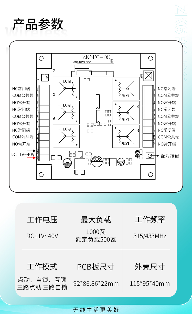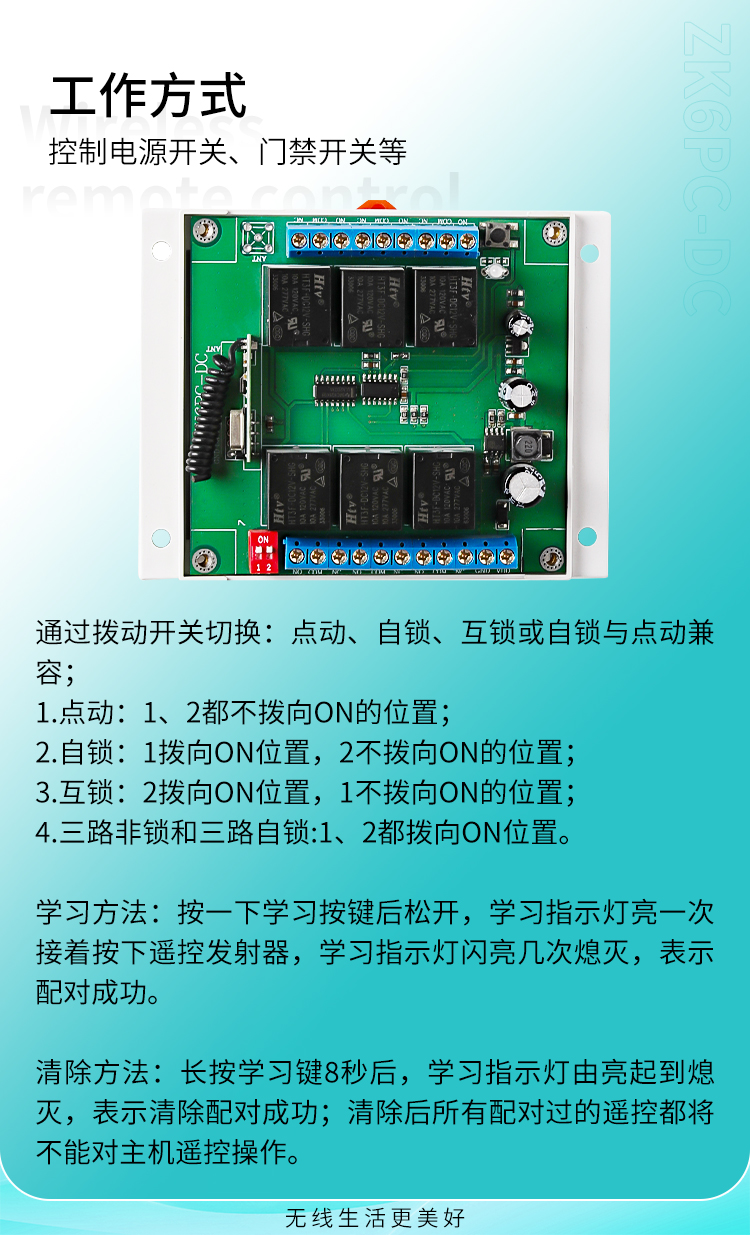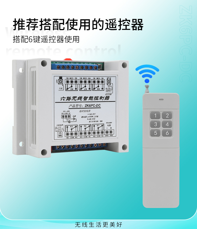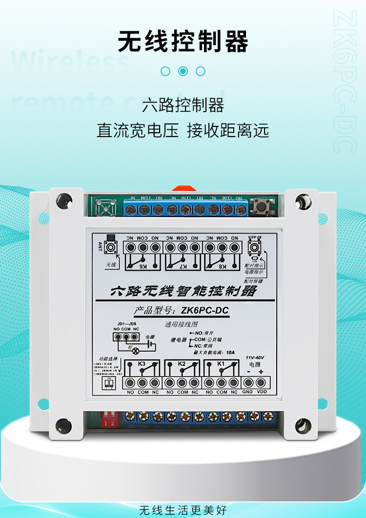 這是一款具有六路繼電器輸出的丝瓜视频下载污遙控智能控製器,主要是麵對各種客戶使用供電電壓不同經常需要改硬件電路去適應客戶而做出的調整,目前這款控製器工作電壓範圍比較寬,在11V~40V工作電壓都可以正常工作,更能接近於滿足客戶供電電壓不同的使用問題。