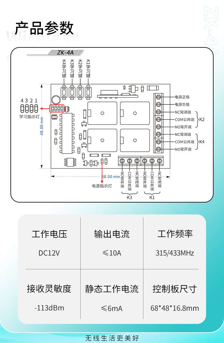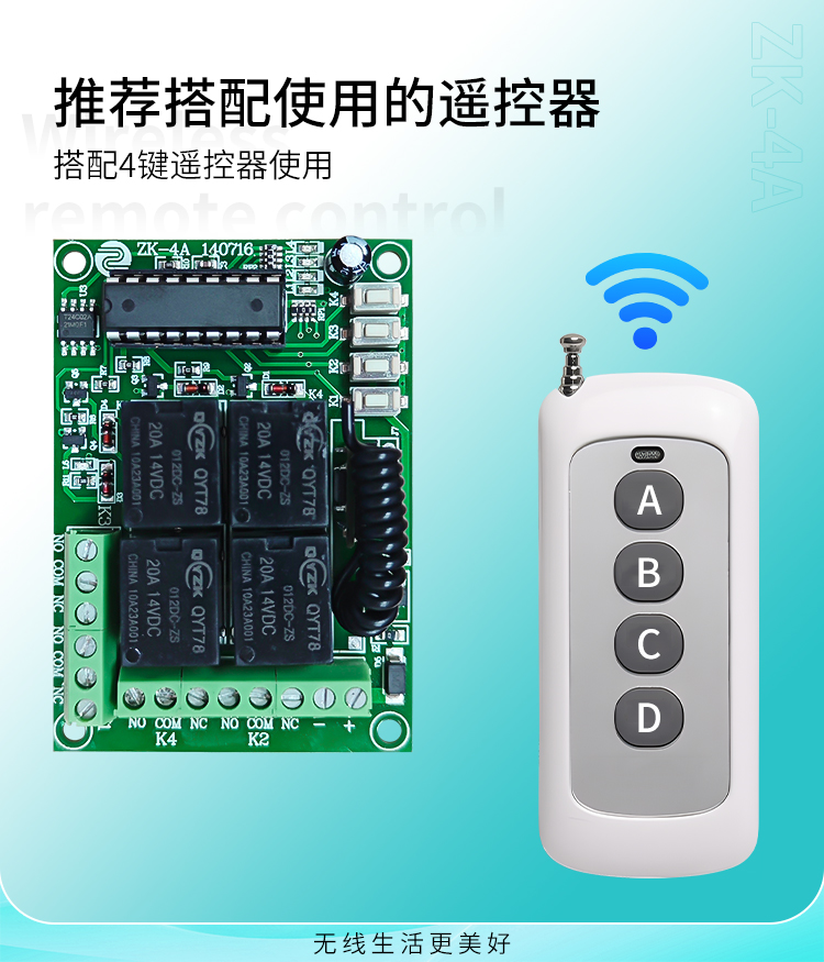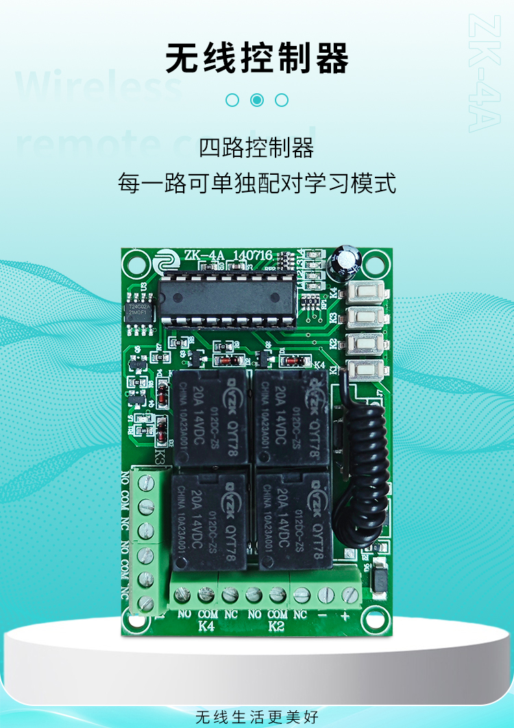 ZK-4A 是一款四路丝瓜视频下载污控製器,它有四個學習按鍵分別學習四路繼電器。,可以將四路學習成不同的工作模式。