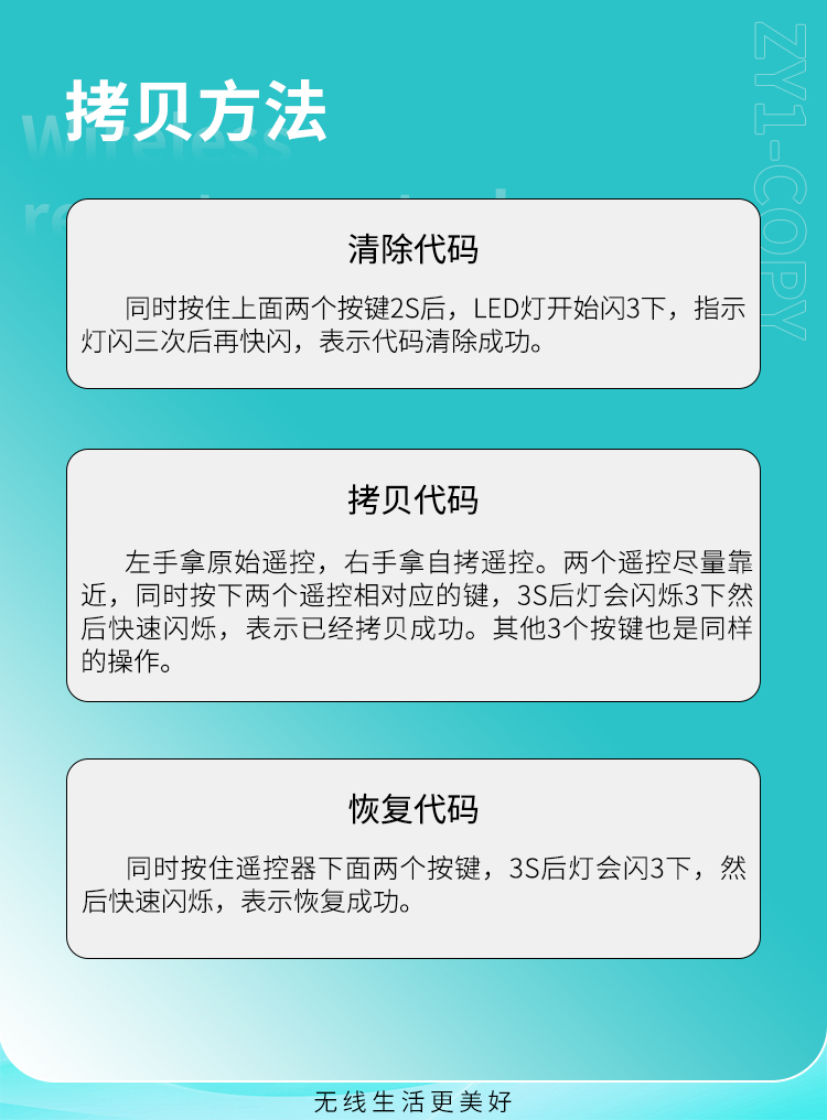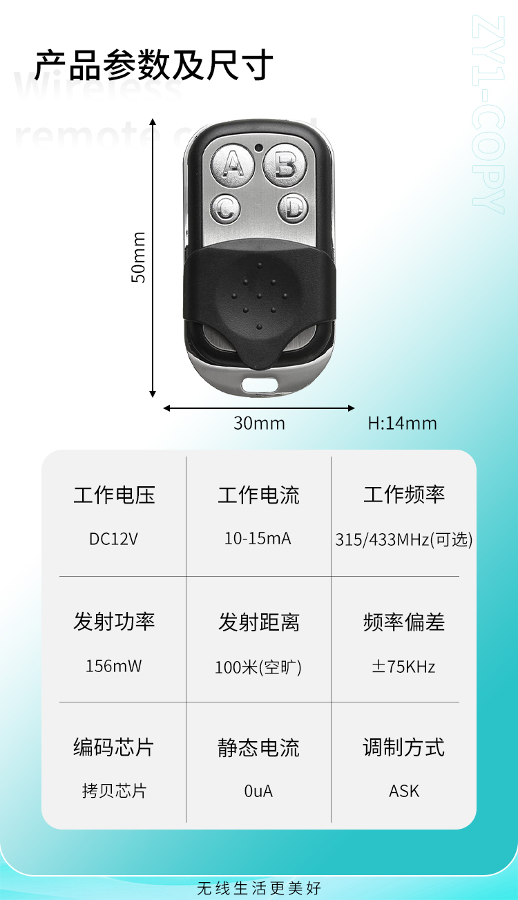 ZY1-COPY 是一款四鍵對拷遙控器,可拷貝同頻率的遙控器,外觀精美
