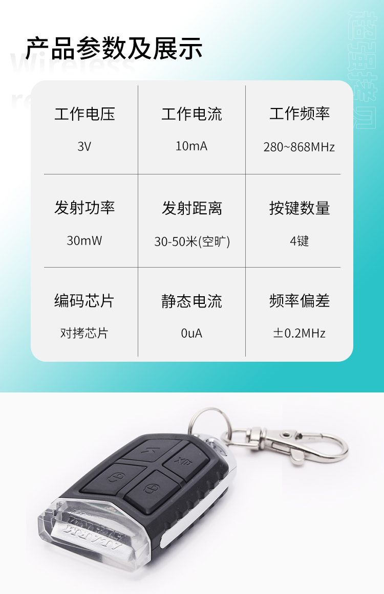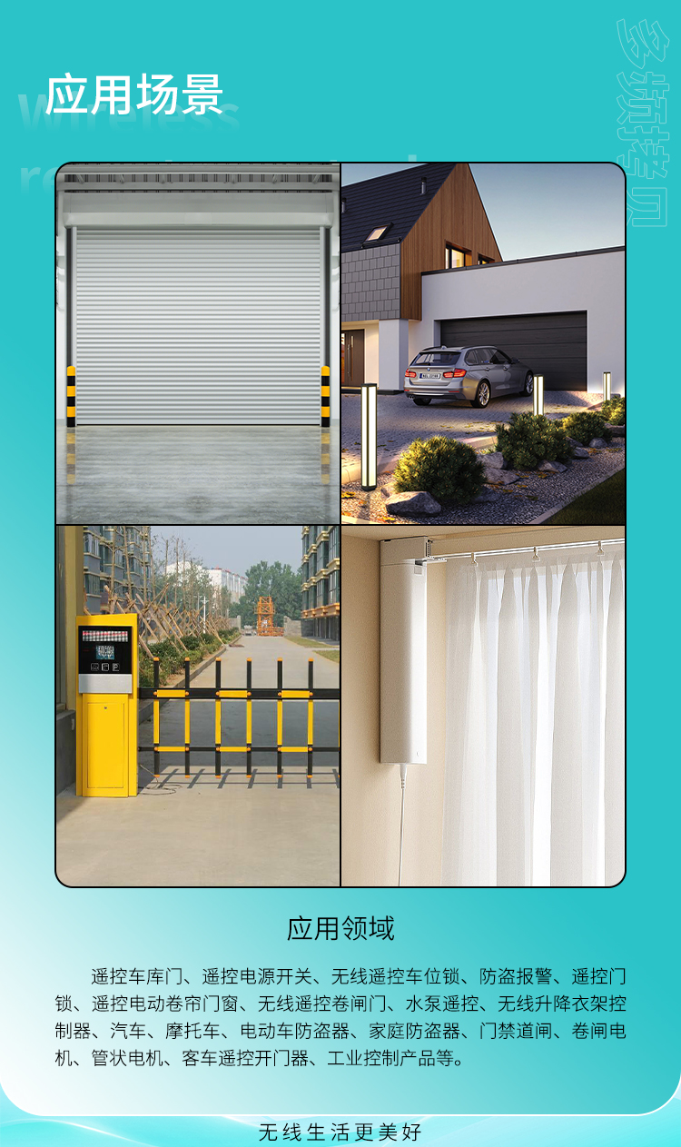 遙控車庫門、遙控電源開關、丝瓜视频下载污遙控車位鎖、遙控門鎖、遙控電動卷簾門窗、節能燈光、家庭防盜係統、工業或家庭遙控控製等。