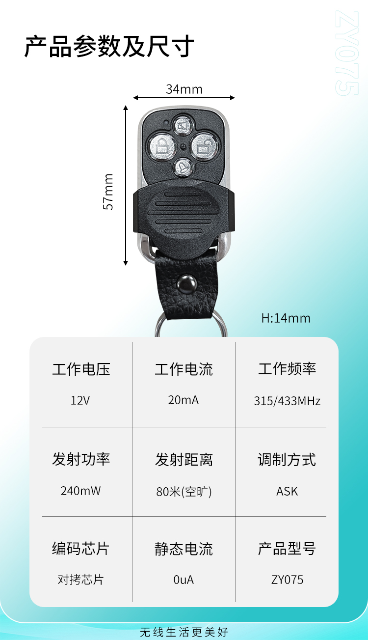 ZY075是一款對拷型丝瓜视频下载污遙控器,滑蓋設計,帶有固定鑰匙扣