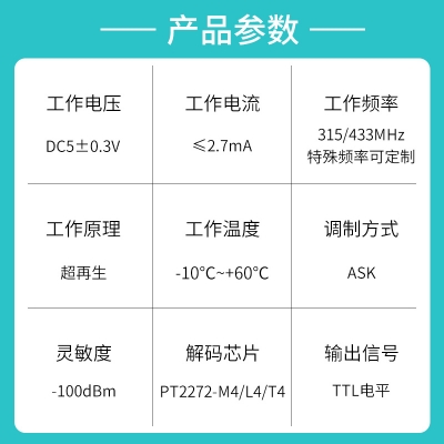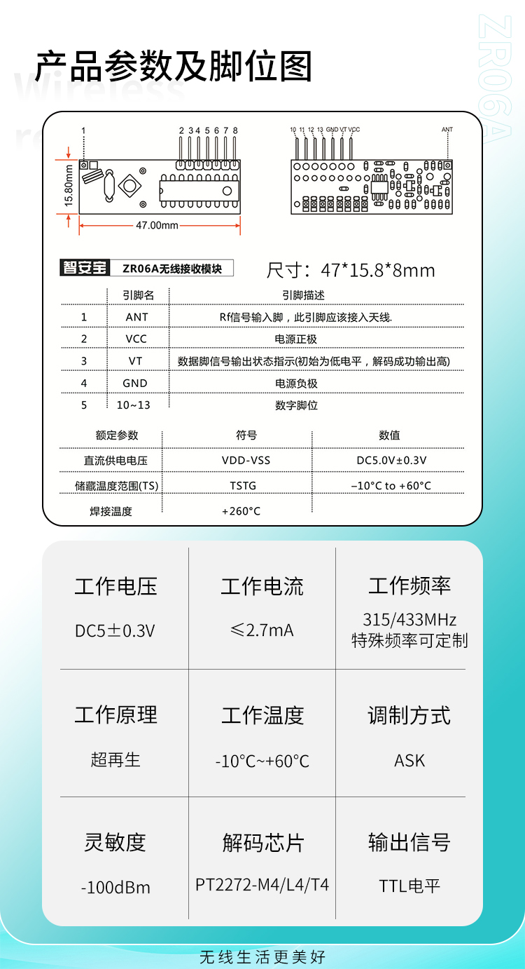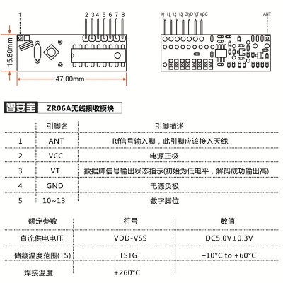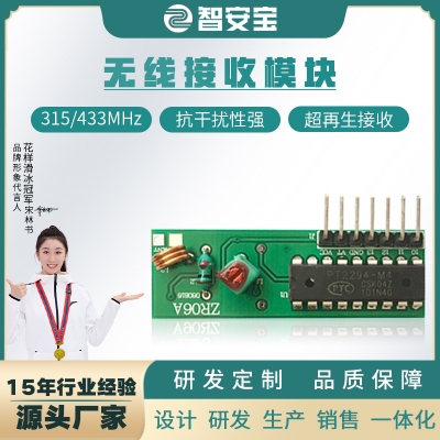 ZR06A接收模塊采用超再生接收電路,線路設計簡單,生產方便,生產成本低,體積小,功效超低,所以被廣泛使用,這種設計有很多優點,它可以和各種解碼電路或單片機配合,設計電路靈活方便。