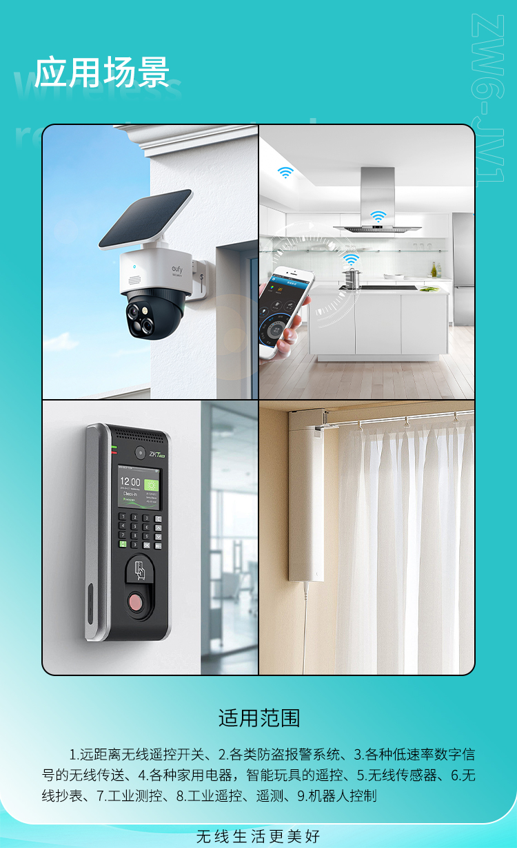 數據傳輸,丝瓜视频下载污遙控開關、遙控插座、道閘、遙控伸縮門、遙控電動門、遙控車庫門、遙控卷閘門、平移門、遙控開門機、關門機等門控係統、遙控窗簾、報警器、遙控摩托車、遙控電動車、遙控玩具、防盜報警主機、汽車防盜產品、家庭防盜產品、遙控LED、遙控音響、安防等民用及工業配套遙控領域。