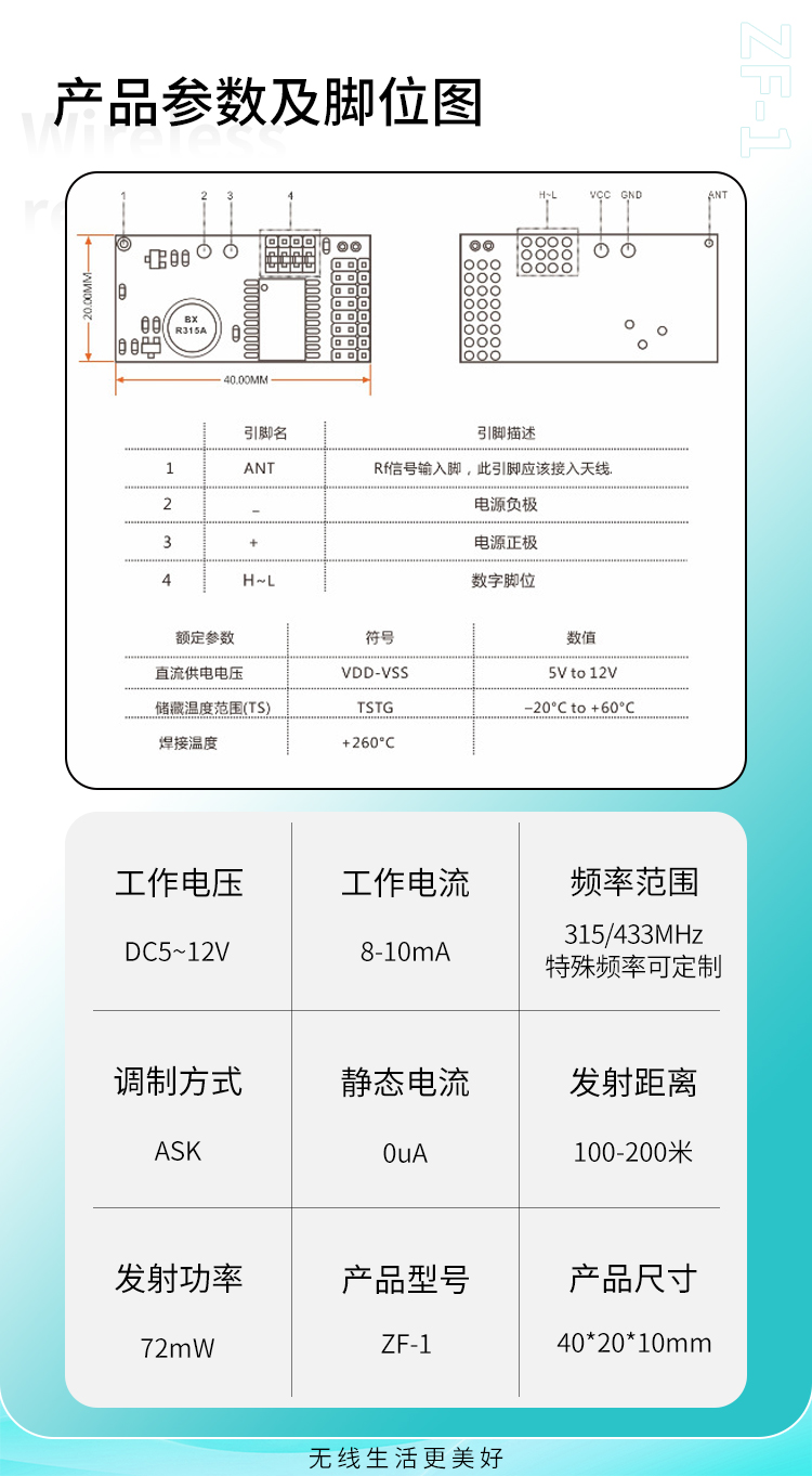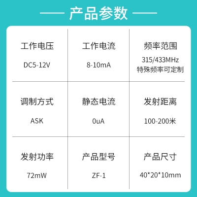 ZF-1該模塊核心電路采用RF12射頻收發芯片,高穩定性,用SMT進口貼片元件以及聲表麵諧振器穩頻;體積美觀。廣泛丝瓜视频在线下载观看在簡易數據丝瓜视频下载污傳輸,丝瓜视频下载污遙控,防盜報警工業遙控,遙測,遙感;及各種低速率數字信號的傳送;各種家用電器,智能玩具的遙控器等場合。