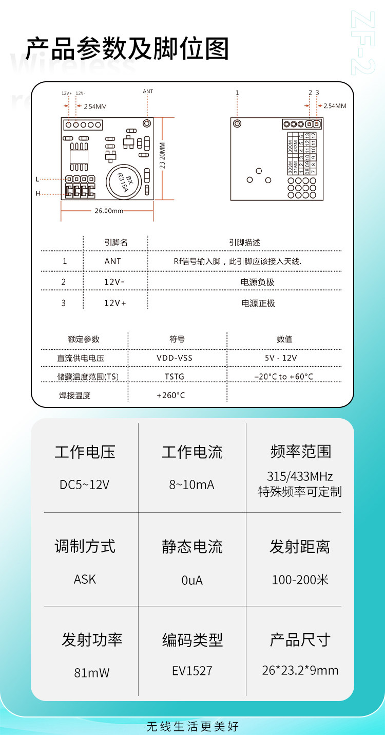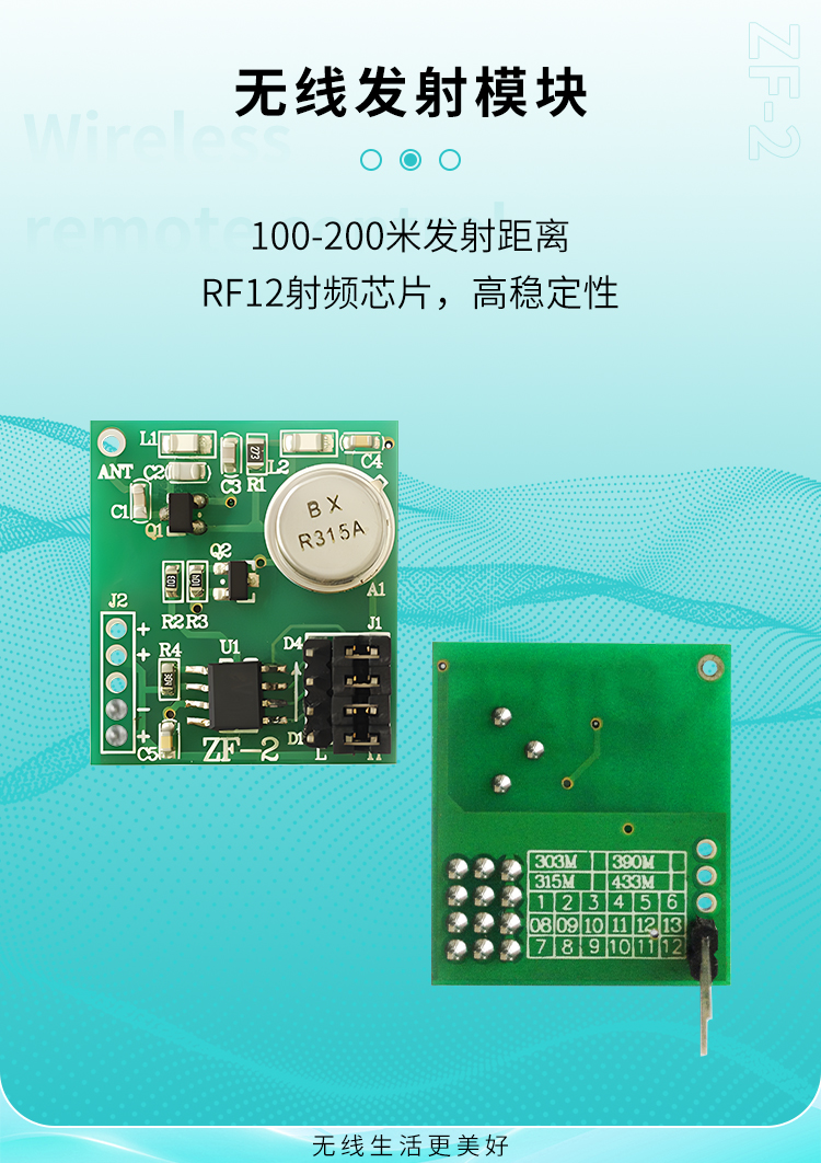 ZF-2該模塊核心電路采用RF12射頻收發芯片,高穩定性,用SMT進口貼片元件以及聲表麵諧振器穩頻;體積美觀。