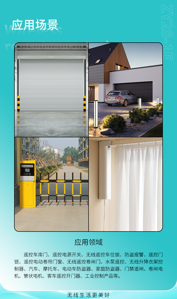 遙控開關、防盜報警、遙控門鎖、遙控電動卷簾門窗、水泵遙控、工業控製產品等;