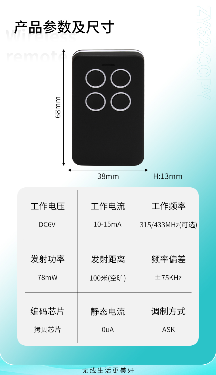 ZY62-COPY是一款具有4個觸發按鍵的丝瓜视频下载污遙控器,。ZY62-COPY丝瓜视频下载污遙控器,可拷貝同頻率的遙控器,外觀精美,具有可靠性高、頻率穩定、穿透能力強等特點;