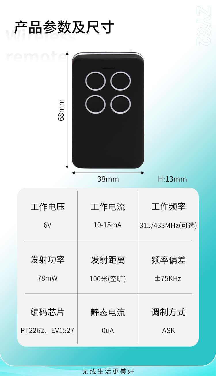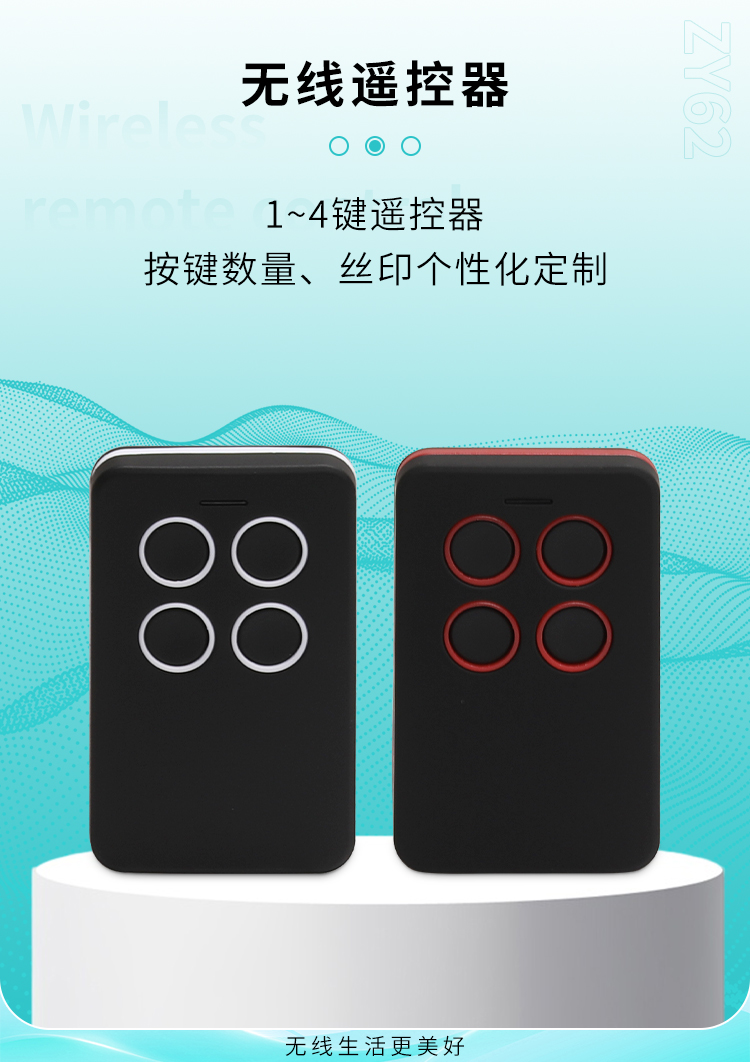 ZY62-4是一款具有4個觸發按鍵的丝瓜视频下载污遙控器,可以跟本公司的接收模塊或控製器配套使用;也可以單獨為客戶丝瓜视频在线下载观看,一般丝瓜视频在线下载观看於丝瓜视频下载污電設備的遙控;如節能燈光、家庭防盜係統、工業或家庭遙控控製等。ZY62-4丝瓜视频下载污遙控器,具有可靠性高、頻率穩定、穿透能力強等特點;其內部電路設計采用聲表麵諧振器穩頻,全部采用SMD工藝,頻率315MHZ或433MHZ可選,編碼芯片采用EV1527,供電電源采用內置CR2016兩節共6V電池供電。