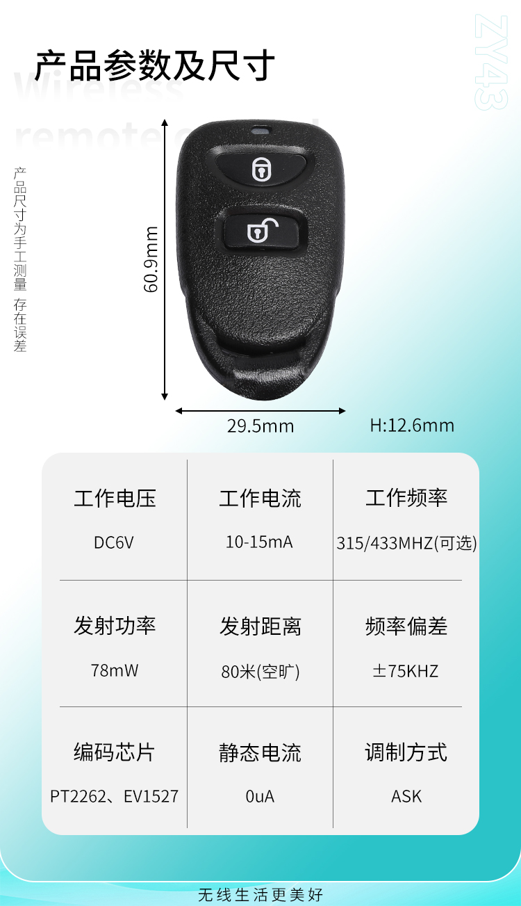 ZY43是一款小功率丝瓜视频下载污遙控器,具有可靠性高、頻率穩定、穿透能力強等特點;