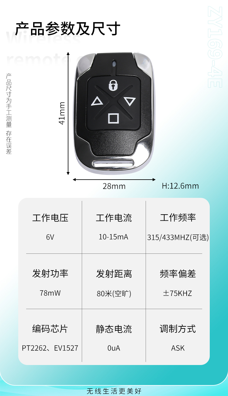 ZY169-4E是一款小功率丝瓜视频下载污遙控器,具有可靠性高、頻率穩定、穿透能力強等特點;
