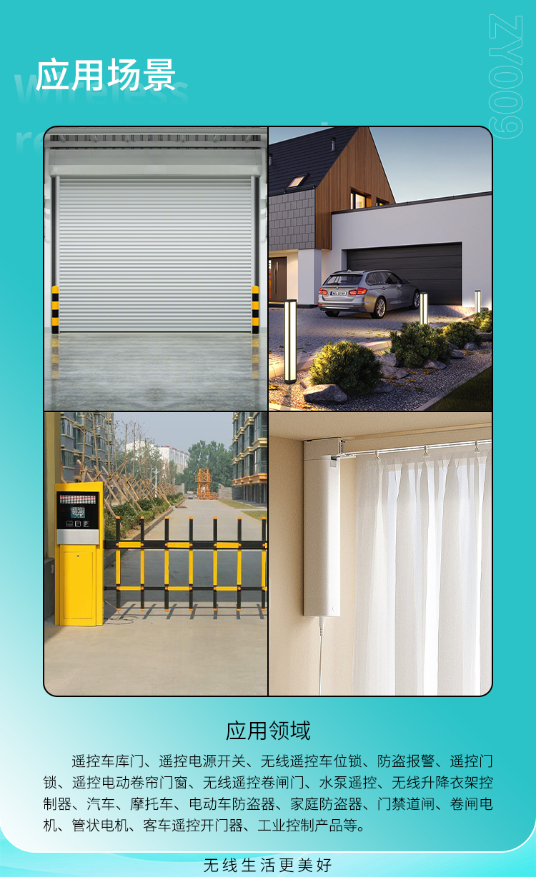 遙控車庫門、遙控電源開關、丝瓜视频下载污遙控車位鎖、遙控門鎖、遙控電動卷簾門窗、節能燈光、家庭防盜係統、工業或家庭遙控控製等。