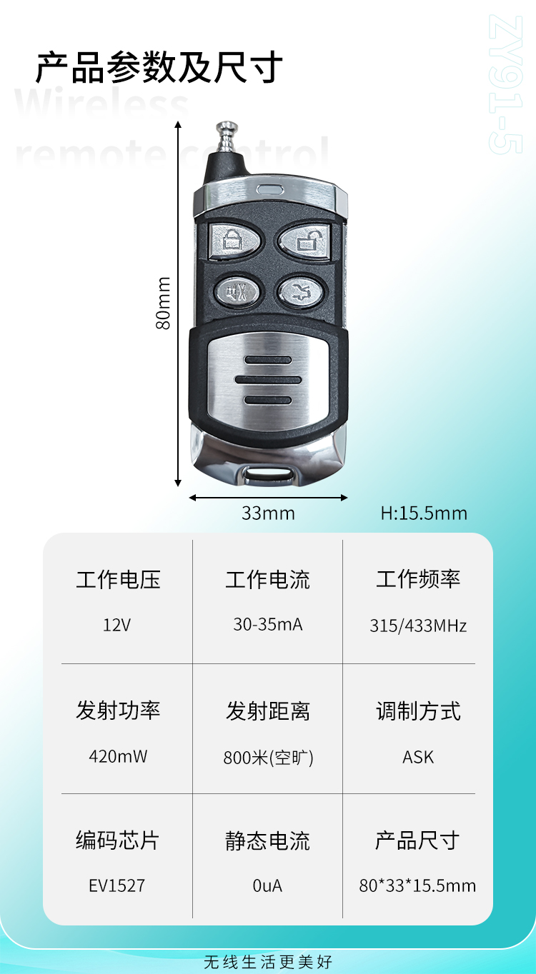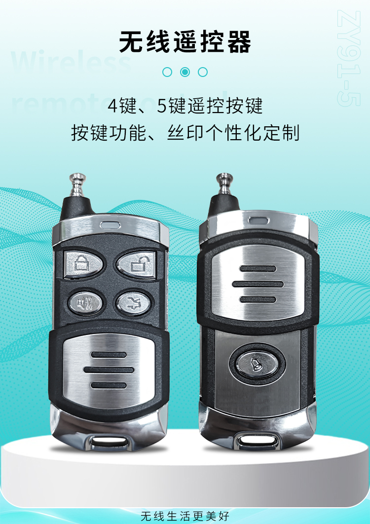 ZY91-5是一款中功率遙控器,體積小距離遠,滑蓋設計,5鍵遙控器