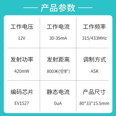 遙控開關、遙控車庫門、防盜報警、遙控門鎖、遙控電動卷簾門窗、水泵遙控、工業控製產品等;