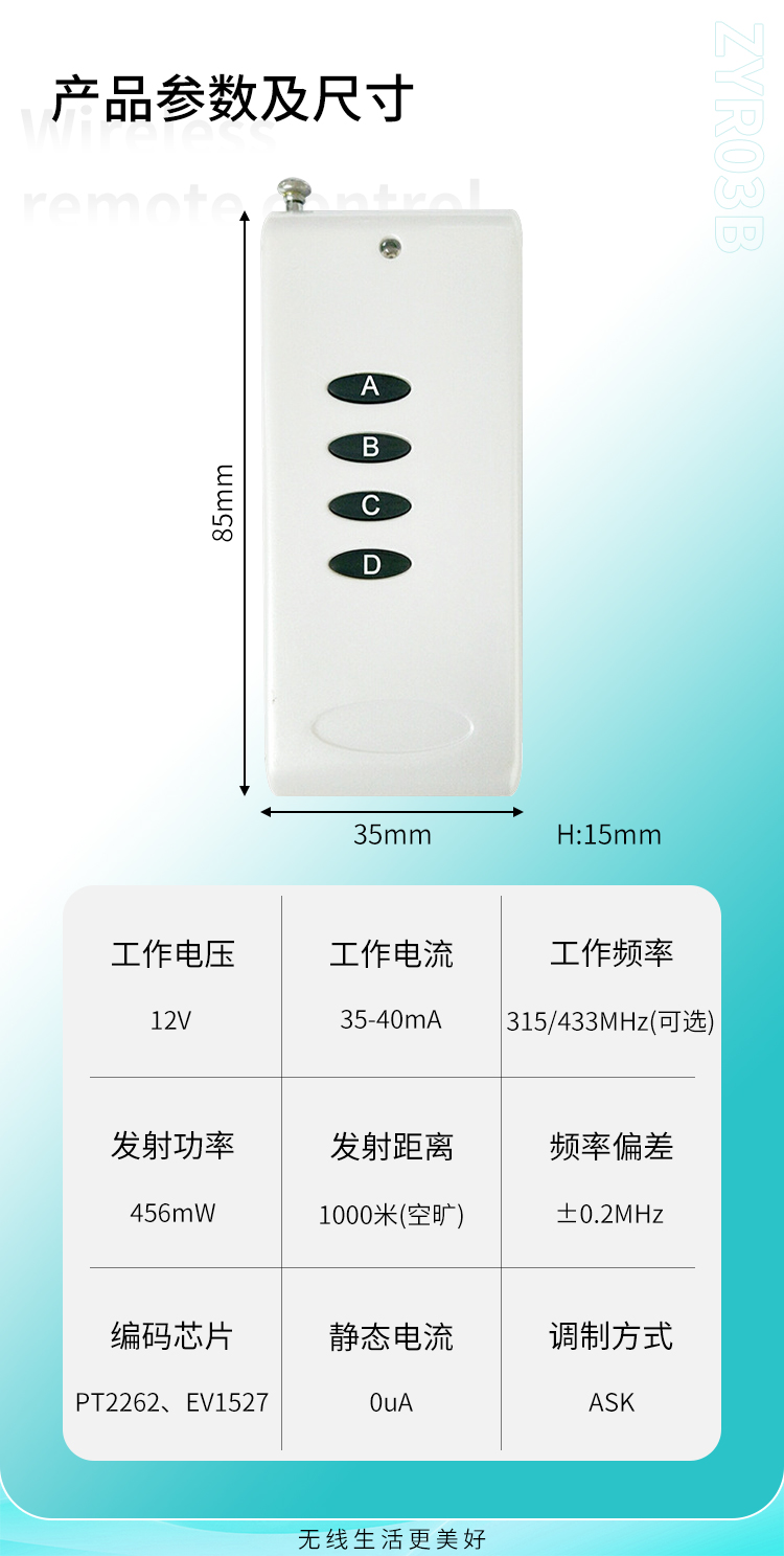 ZYR03B是一款中功率遙控器,體積大,手感好,具有可靠性高、頻率穩定、穿透能力強等特點;