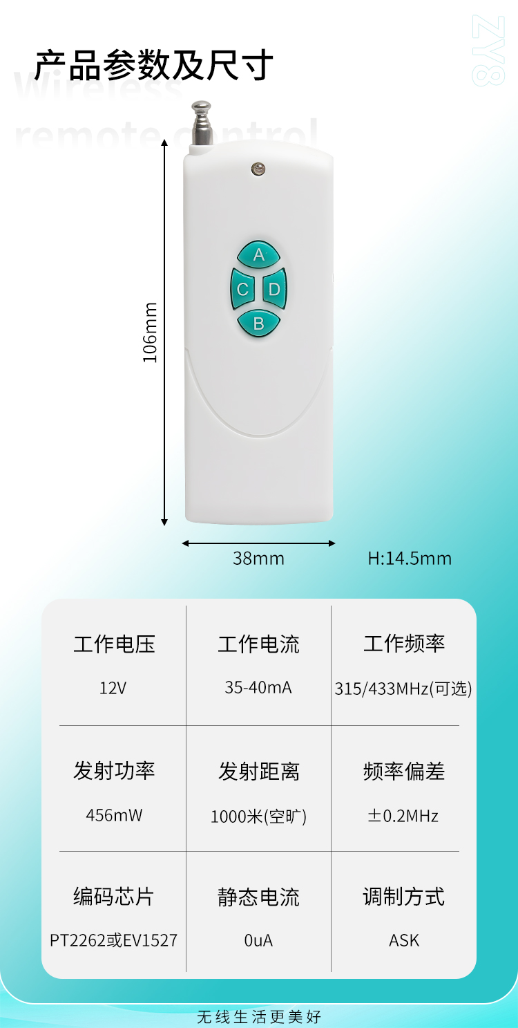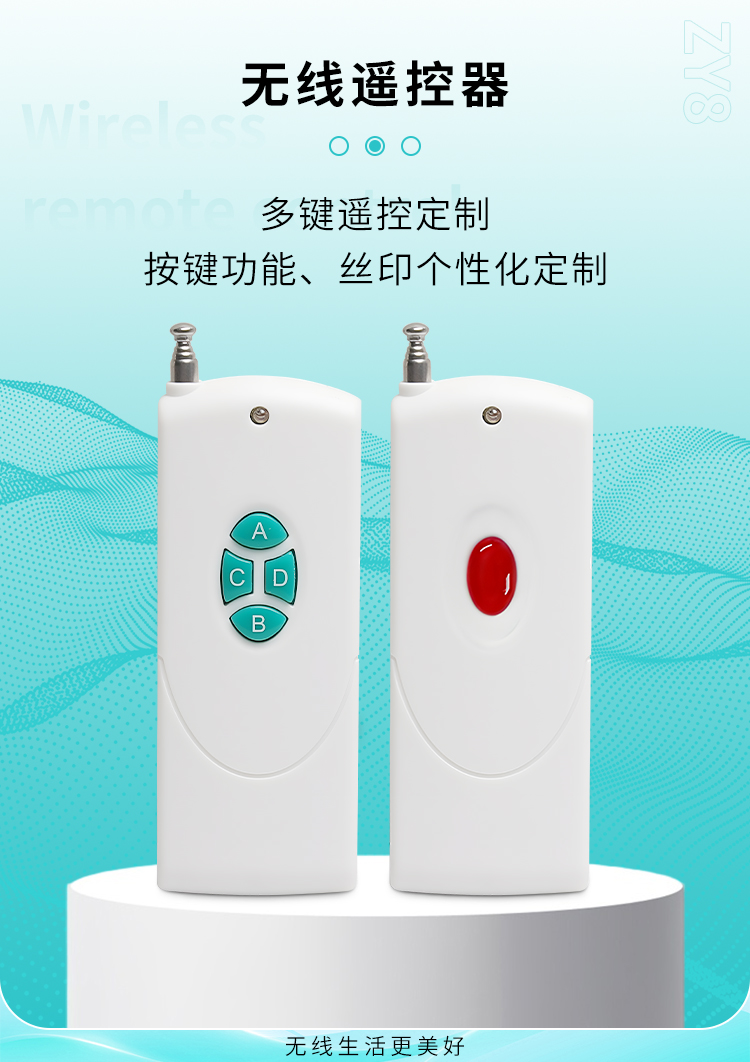 ZY8是一款中功率丝瓜视频下载污遙控器,1鍵4鍵可選,具有可靠性高、頻率穩定、穿透能力強等特點;