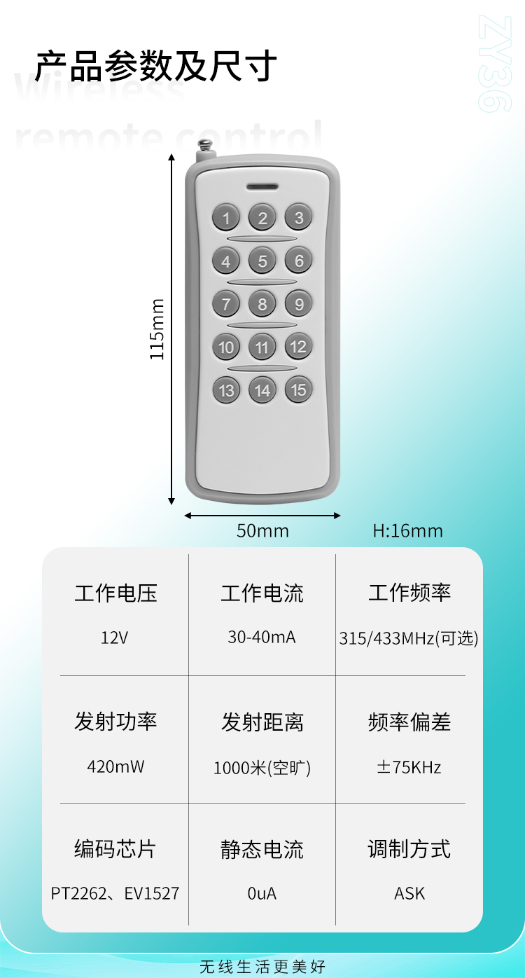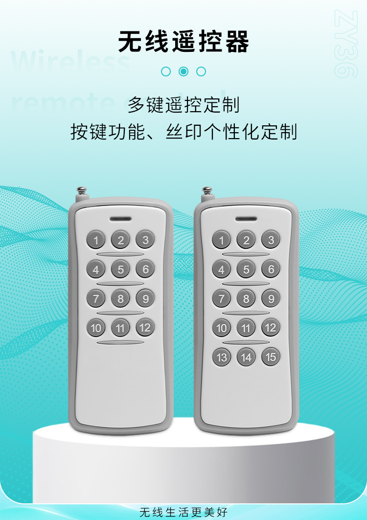 ZY36是一款中功率遙控器,12鍵、15鍵可選,外觀精美,具有可靠性高、頻率穩定、穿透能力強等特點;