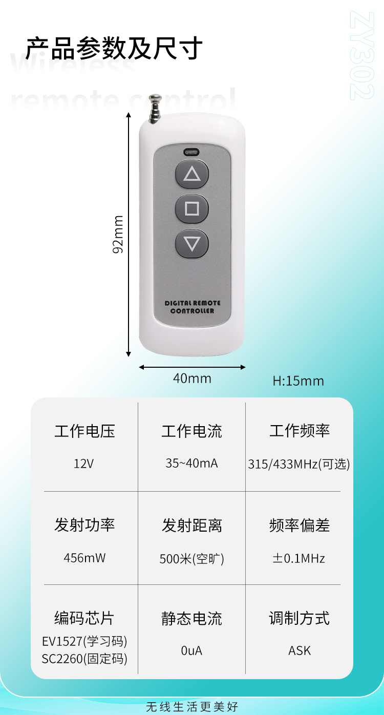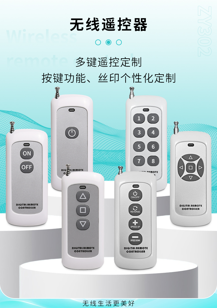 ZY302是一款中功率遙控器,多種按鍵規格可以選擇,具有可靠性高、頻率穩定、穿透能力強等特點;