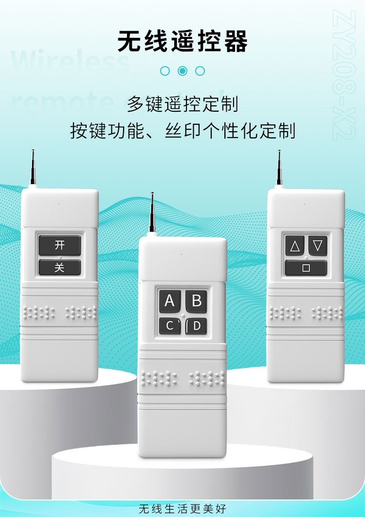 ZY208-X2是一款中功率遙控器,2鍵、3鍵、4鍵可選,外觀精美,質感好