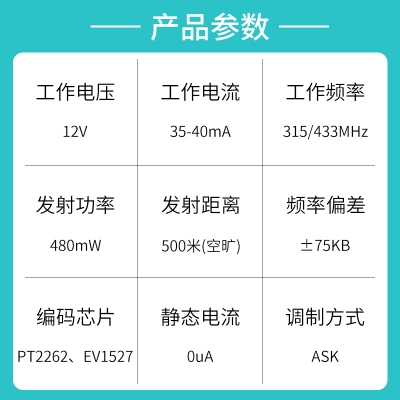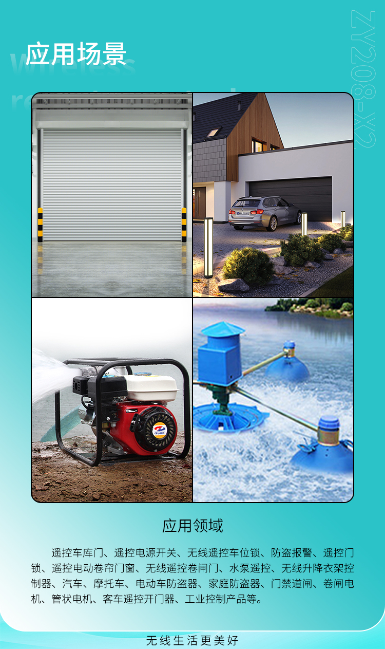 遙控開關、防盜報警、遙控門鎖、遙控電動卷簾門窗、水泵遙控、工業控製產品等。