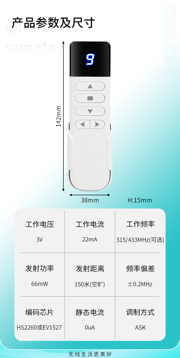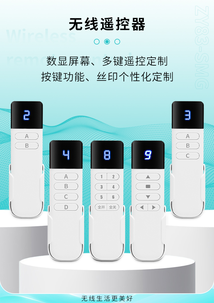 ZY83-SMG是一款帶有數顯屏的遙控器,外觀精美,多種按鍵可選擇,帶有底座,具有可靠性高、頻率穩定、穿透能力強等特點;
